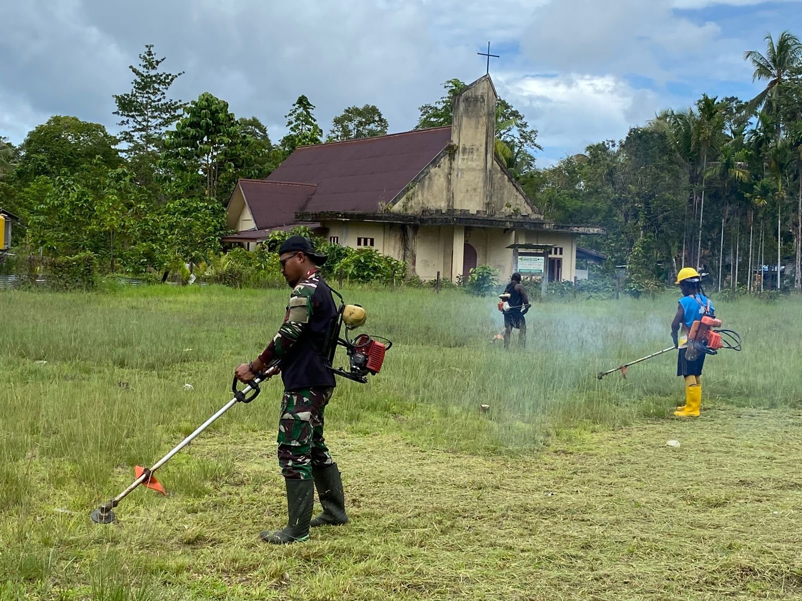 Dalam kegiatan tersebut, personel Pos Aramsulki bersama warga bergotong royong membersihkan area sekitar gereja dengan memangkas rumput di lapangan depan gereja, serta merapikan lingkungan pasar untuk aktifitas jual beli masyarakat.